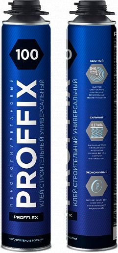 КЛЕЙ-ПЕНА УНИВЕРСАЛ PROFFIX 100 - универсальный однокомпонентный полиуретановый клей-пена – применяется для быстрого и прочного склеивания большинства строительных материалов и конструкций за исключением изделий из тефлона (фторопласта), полиэтилена, полипропилена и покрытых льдом.