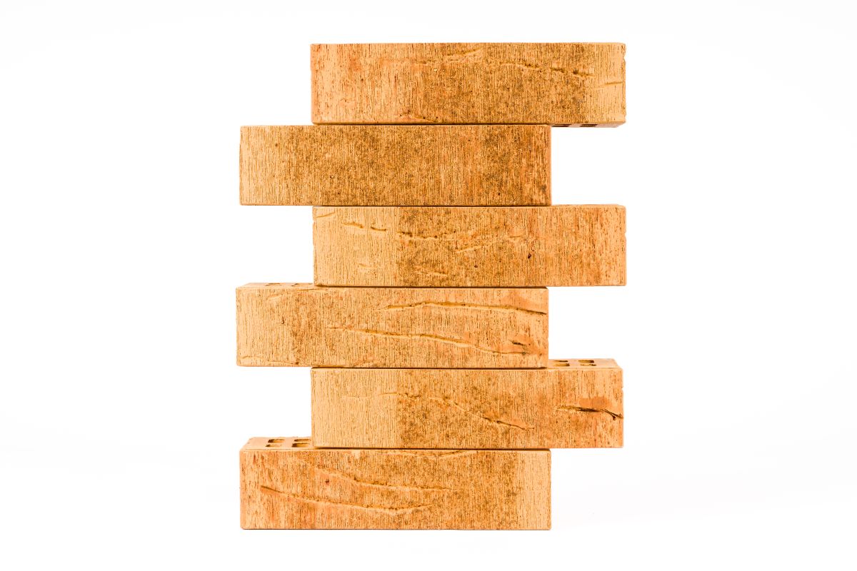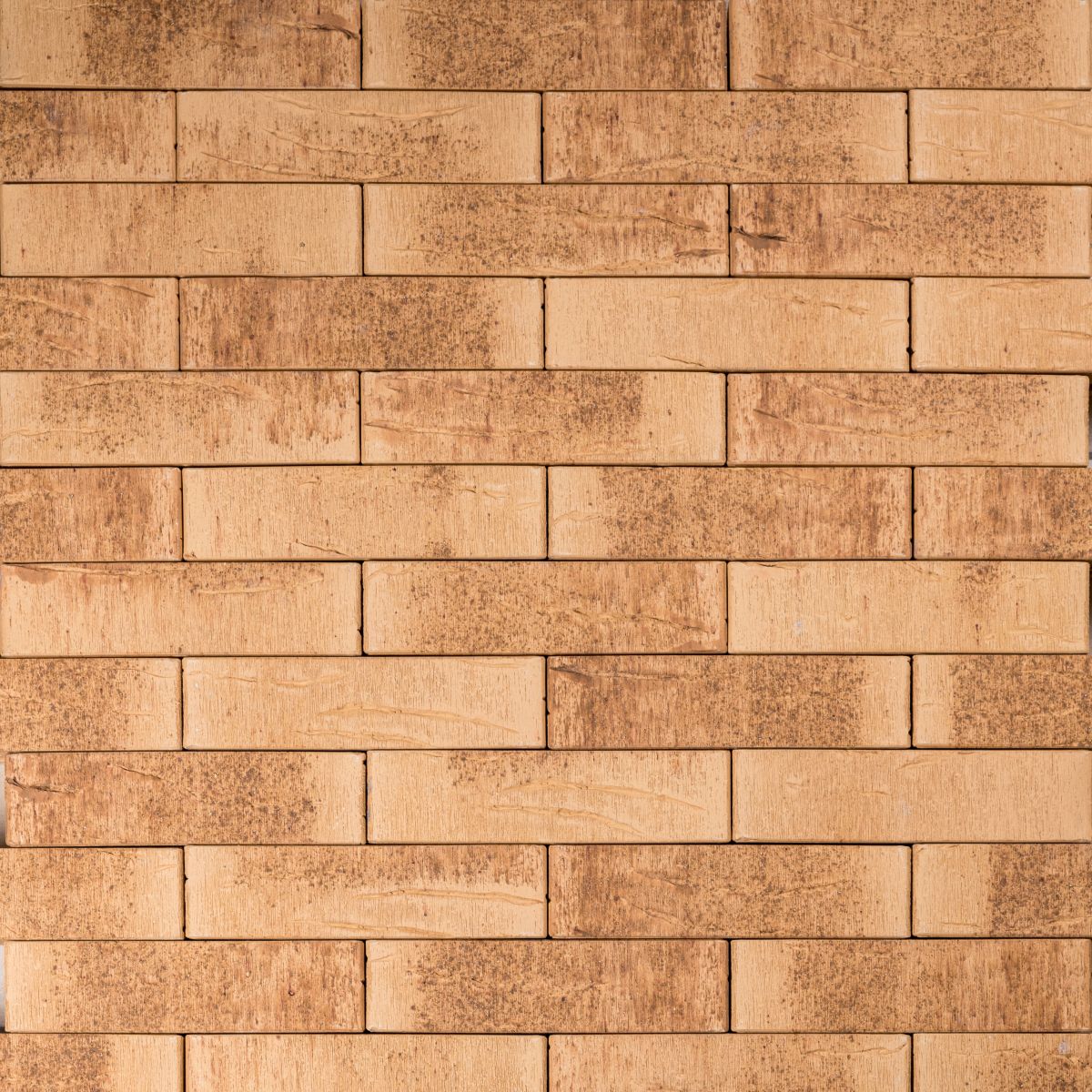 "Камень счастья" - имеет, как и вся линейка Тайга Вулканы, вельветовую фактуру с небольшими наплывами и легкими продольными углублениями. Форма кирпича с неровными краями. Основа этого кирпича излучает светло-желтоватый оттенок, а декоративное нанесение красно-коричневого цвета придает узору яркий, пестрый паттерн, словно улучшая силу и радость, которые он несет. Кирпич имеет текстуру: тростник/ бархат + легкий королевский двор + рваная фаска.