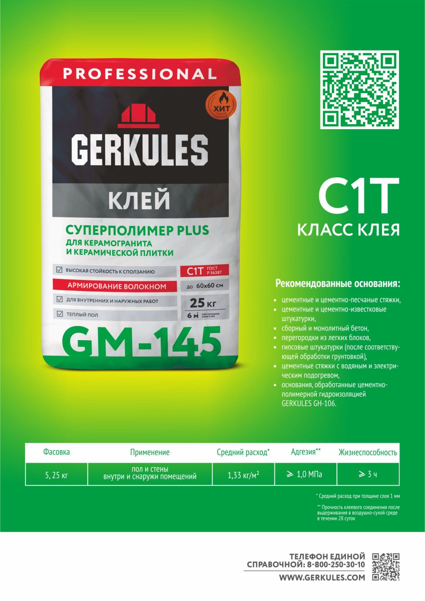 Профессиональная клеевая смесь Геркулес на цементной основе. Применяется для укладки на пол и стены керамогранита керамической плитки, керамической мозаики внутри и снаружи помещений. Подходит для помещений с любым уровнем влажности. Также применяется для «теплых» полов внутри помещений. Рекомендован для формата плитки до 60х60 см внутри помещений и до 45х45 см снаружи помещений.