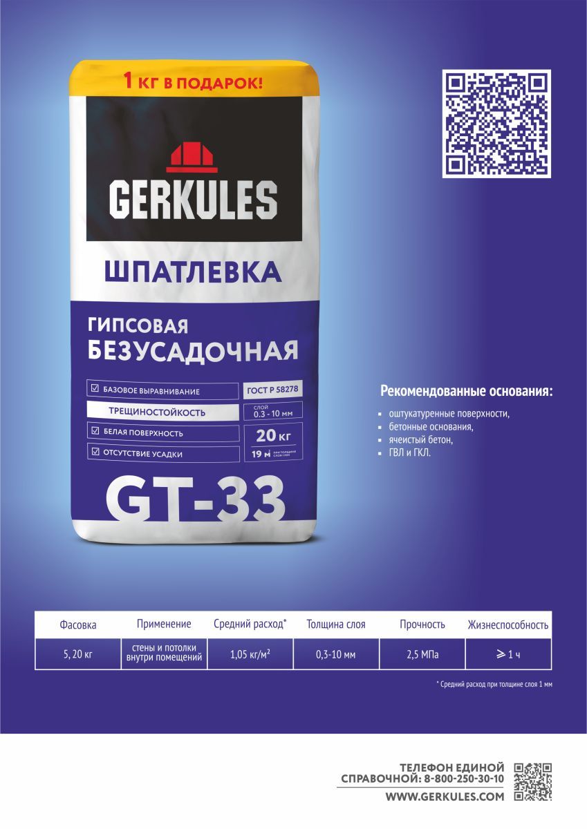 Шпатлевка 20кг безусадочная GT33 Геркулес
